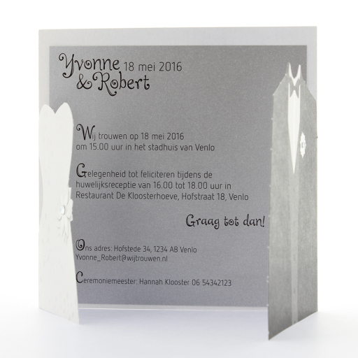 Vrolijke uitklapkaart met grappig bruidspaar in de kever.
