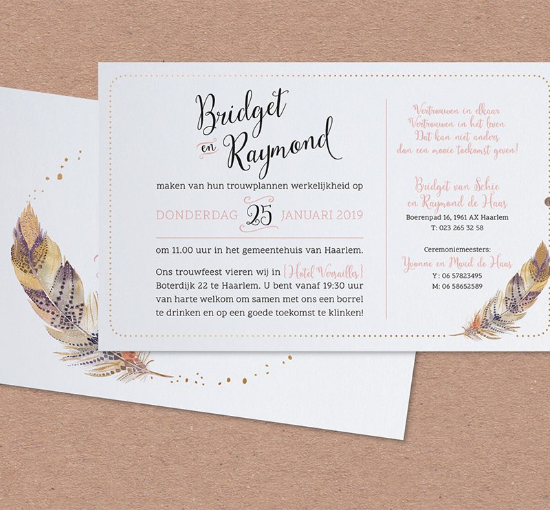 Moderne trouwkaart in ‘Bohemian Style’ met veermotief en leder koordje.