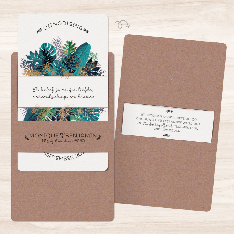 Uittrekbare trouwkaart in botanische sferen met gouden folie details