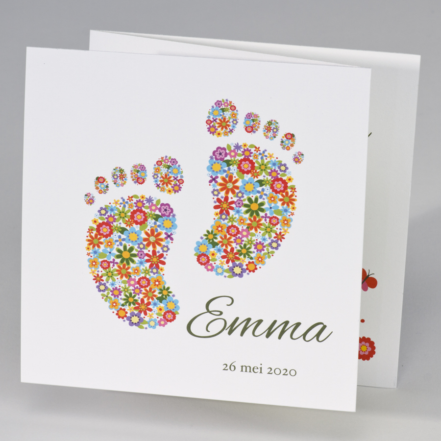 Kleurrijk drieluik kaartje met babyvoetjes versierd met een vrolijk bloemenpatroon in felle kleuren.