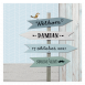 Stoer geboortekaartje met houten bordjes als welkom voor jullie zoon en afgewerkt met zilveren bewerking.