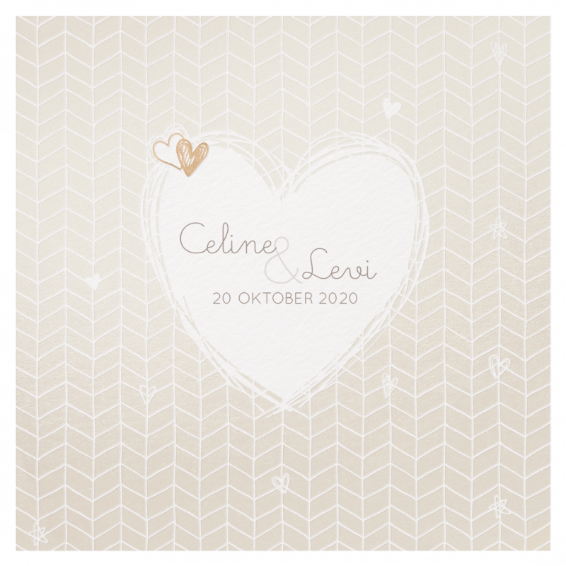 Klassieke trouwkaart met parelmoer patroon en gouden hartjes.