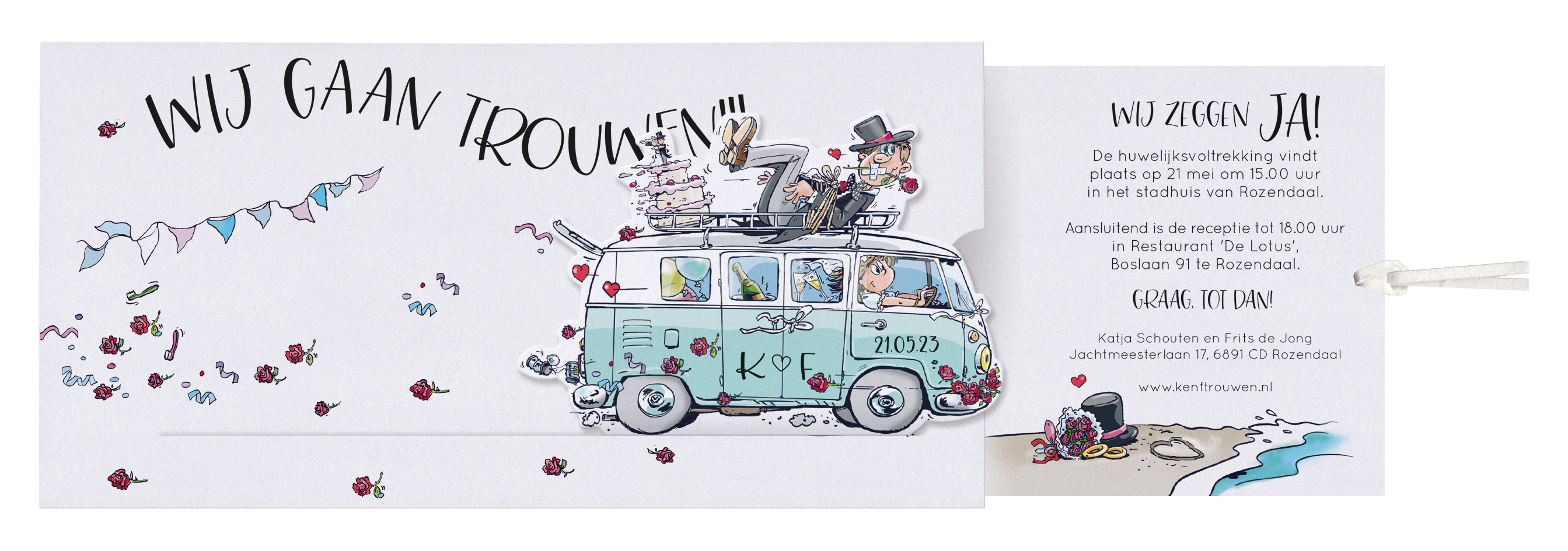 Vrolijke trouwkaart met bruidspaar in een Volkswagen bus.